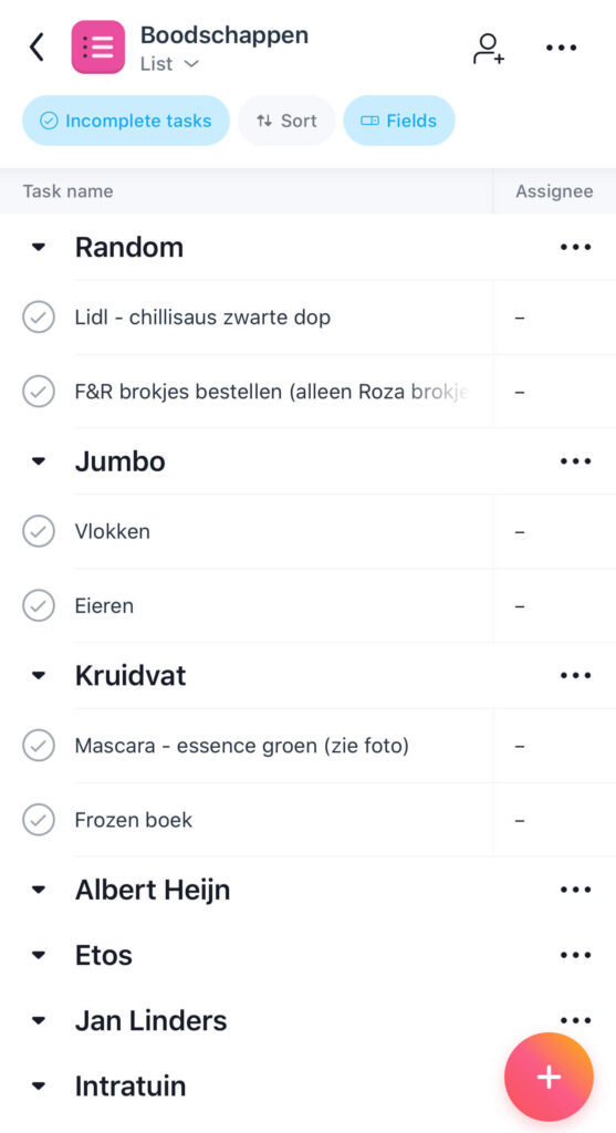 Asana is ook toegankelijk op mobiel met een handige, overzichtelijk app. Sander en ik gebruiken ‘een project’ als boodschappenlijst. Superhandig, want je kan altijd iets wat je bedenkt toevoegen aan het lijstje. Als je toevallig bij de winkels bent, bekijk je de app of er toevallig nog iets nodig is, en koopt dat dan. En ook, wanneer Sander al bij de winkel is en ik bedenk nog wat, dan zet ik het gewoon erop en ziet Sander het sowieso nog omdat hij met de app door de winkel loopt. Heel handig en echt een aanrader. Wij hebben per winkel een lijstje gemaakt.