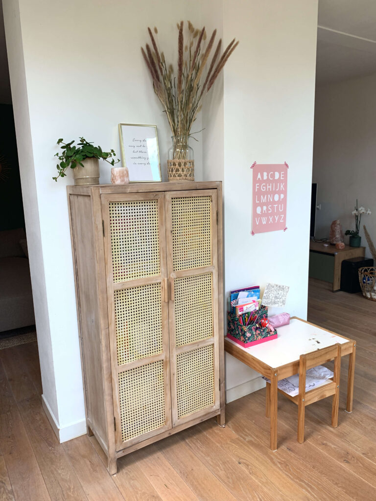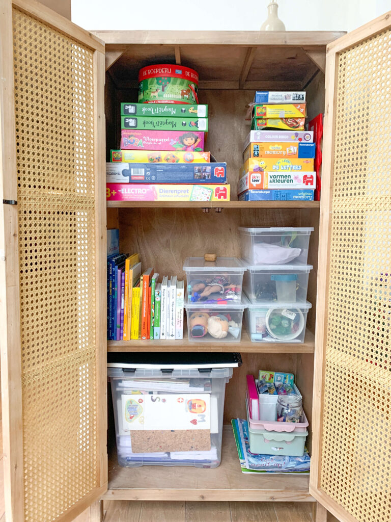 Nu de Herfst begonnen is en ik dus erg geïnspireerd ben geraakt door The Home Edit ben ik het opruimen naar next level aan het brengen en ben ik ons huis aan het optimaliseren. Ik heb onlangs bij Xenos een webbing kast besteld voor in onze woonkamer. Al het speelgoed van Jade zat namelijk in 2 diepe lades. Hierdoor kon ze eigenlijk niet zo goed zien wat ze allemaal had. Ik heb het nu in deze kast op deze manier opgeruimd. Zo veel beter, want Jade speelt nu weer met ander speelgoed, leest andere boekjes én ruimt het zelf weer op!